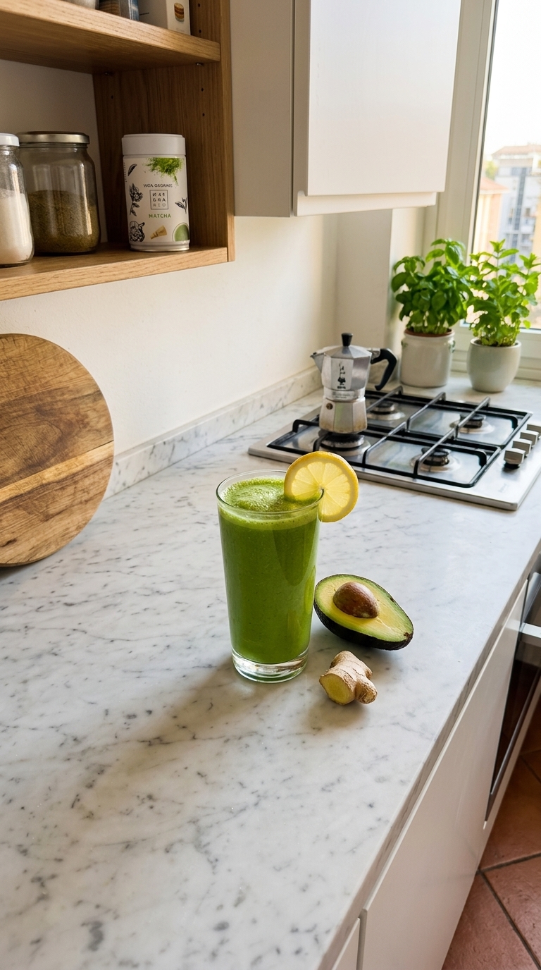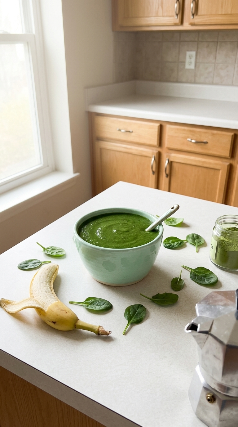Spinacino fresco, banana, mezzo cucchiaino di matcha e latte di avena — frullato e via. Cioè non è niente di rivoluzionario ma ogni volta che lo facci…