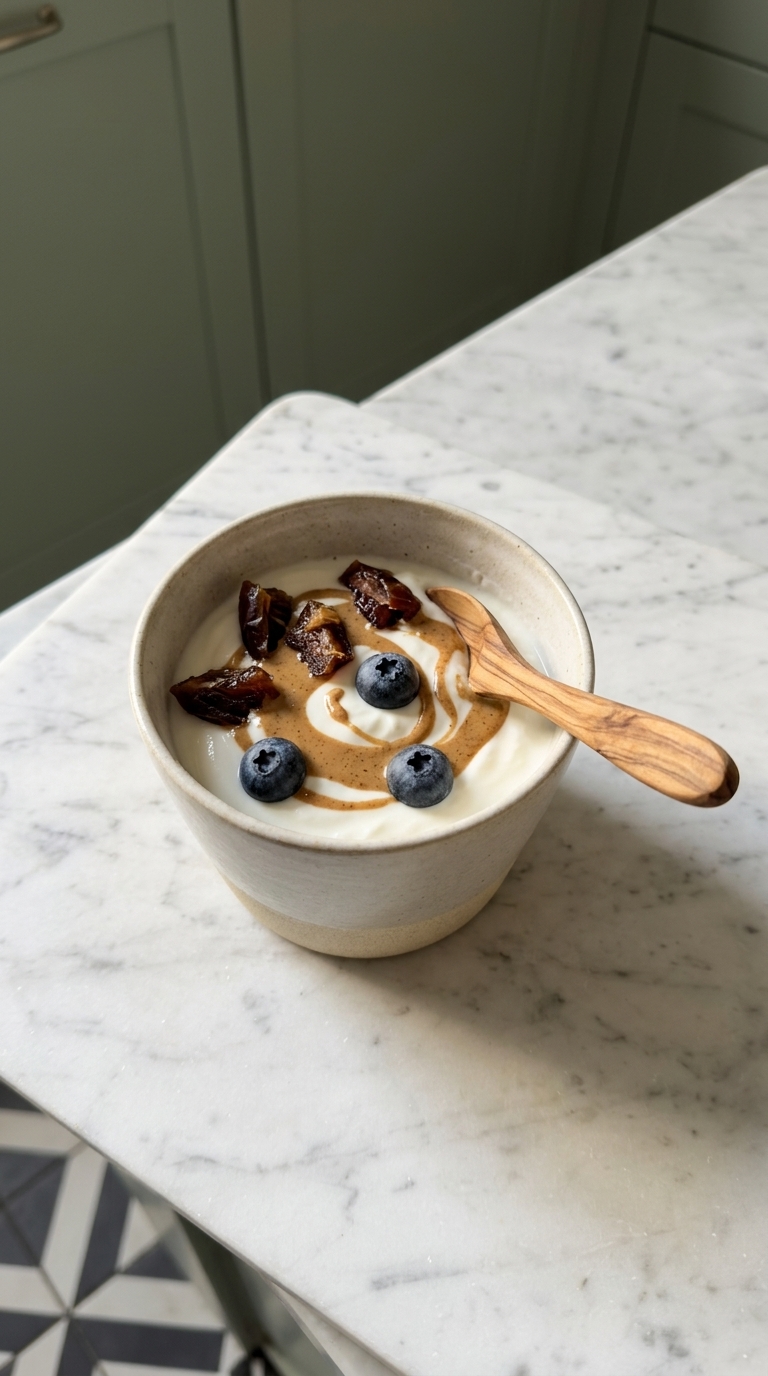 yogurt greco + un cucchiaio di burro di mandorle + qualche dattero spezzato sopra. finito. cioè lo so che non è una ricetta, ma dopo un'ora in palest…