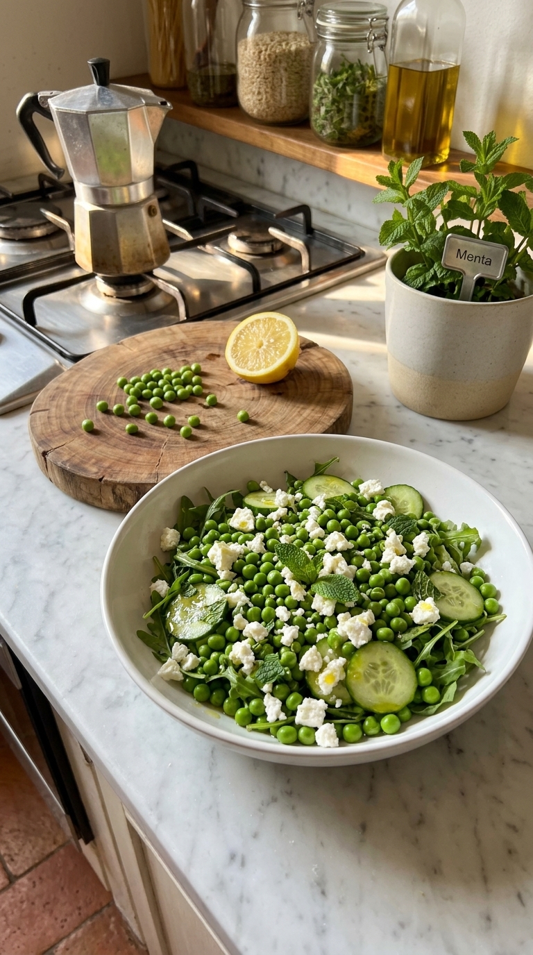 Piselli freschi sgranati a mano, feta sbriciolata, foglie di menta, un po' di rucola e cetriolo a fettine sottili. Condimento: olio evo, limone, sale.…