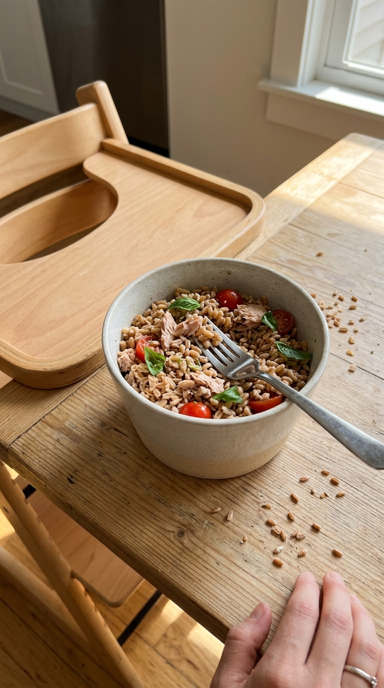 Con Leone sul fianco: pasta fredda di farro, tonno, pomodorini e basilico. Fine. Cioè lo so che non è una ricetta, è più un assemblaggio. Però il far…