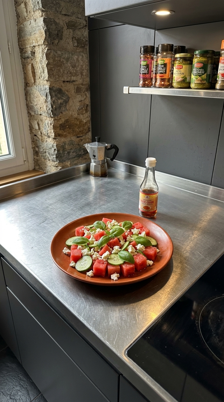 Esperimento del giorno: anguria, feta, cetriolo, foglie di basilico, un filo d'olio buono e — qui viene la parte strana — qualche goccia di salsa di p…