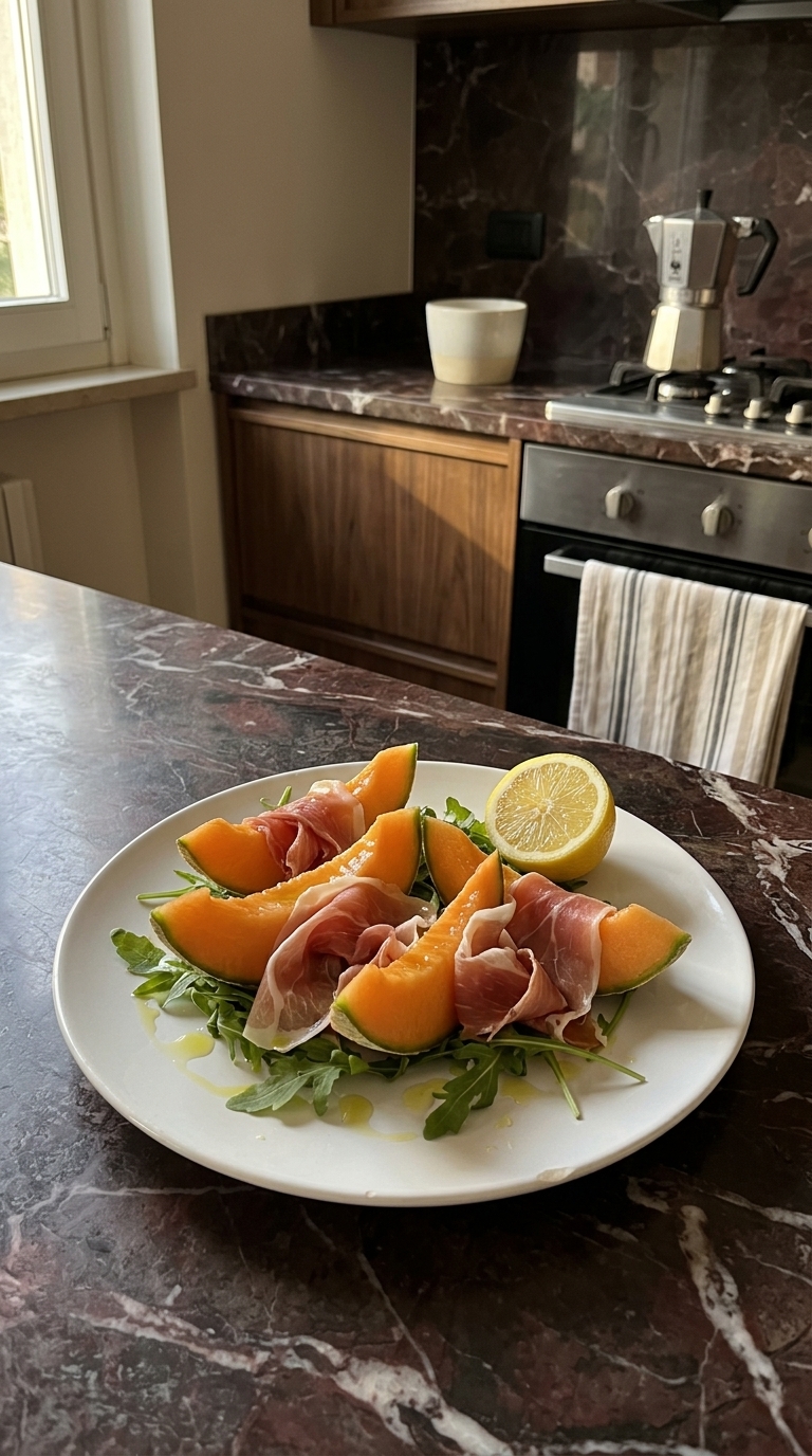 Non è una ricetta, è una mossa di sopravvivenza. Melone Cantalupo a fette, prosciutto crudo (quello vero, non quello acquoso), rucola sotto. Un filo…