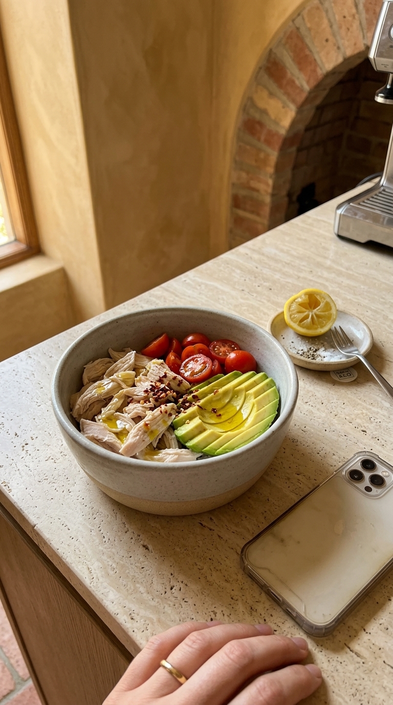 Petto di pollo avanzato dal giorno prima, mezzo avocado che stava per fare quella faccia, limone, sale e un po' di peperoncino. Fine. Cioè l'ho messo…