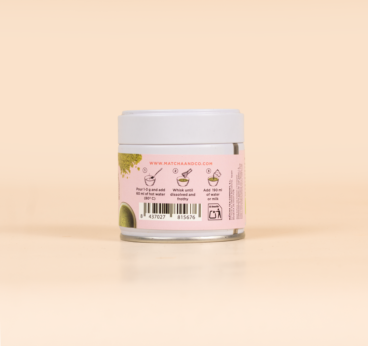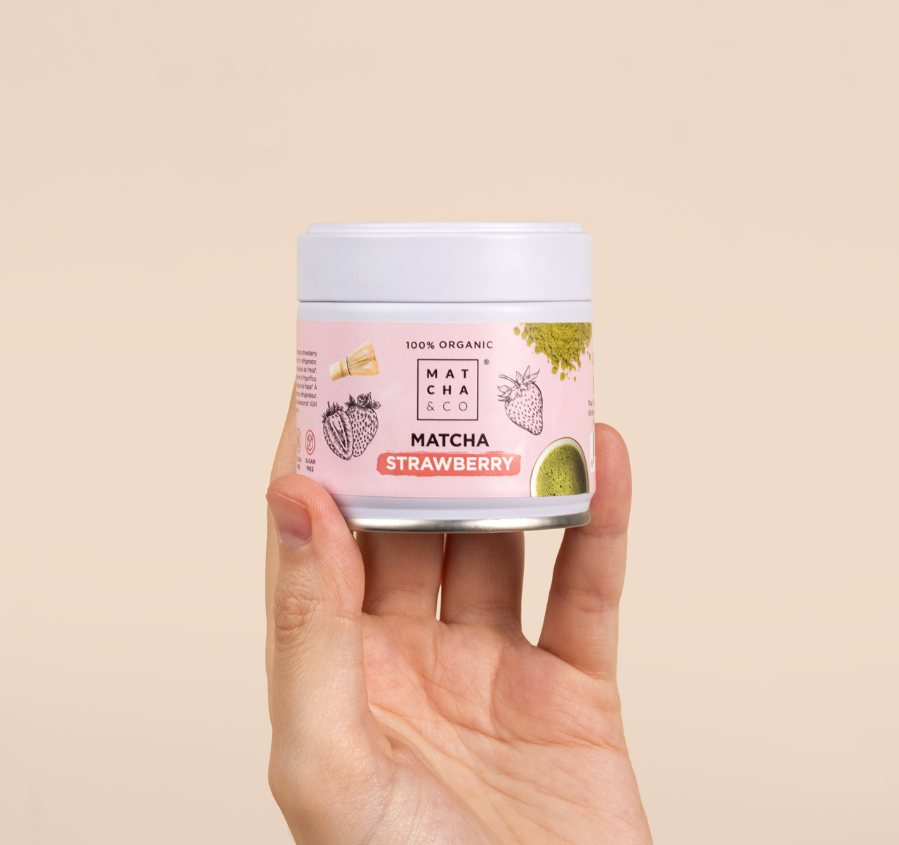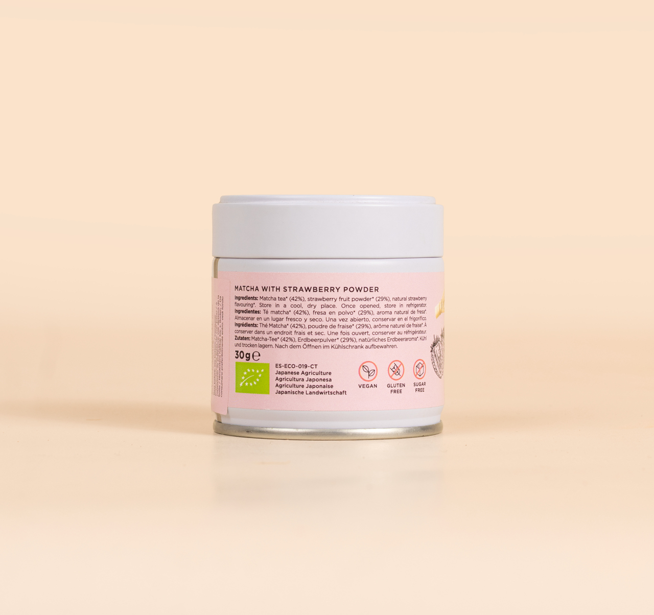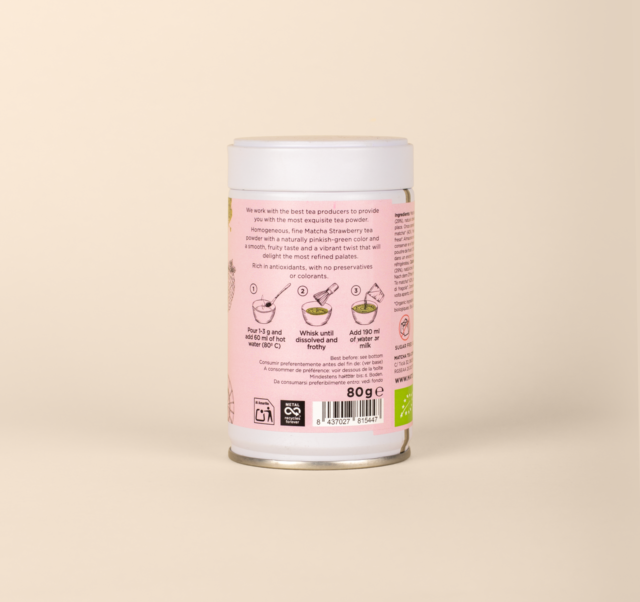 Ceremoniële biologische matcha-theepoeder uit Japan, gecombineerd met aardbei voor een heerlijke ervaring. Rijk aan antioxidanten, het geeft je natuurlijke energie zonder toegevoegde suikers, kleurstoffen of conserveermiddelen.